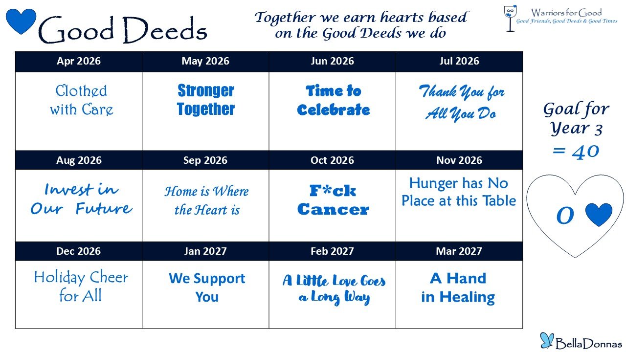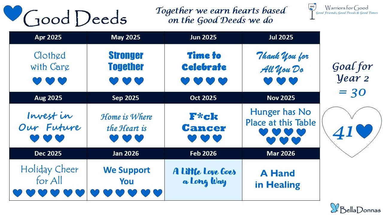Nov 2025 - “Pack the Pantry” We gave hunger a HUGE hug by donating food to local pantries, soup kitchen, missions, shelters, churches, etc. We used $75 dollars we donated towards making 138 to go snack bags for the Lazarus House – Good Shepherd Food Bank. Once again, our good deed hearts show up!! We donated 734 items earning us 3 Good Deed Hearts!